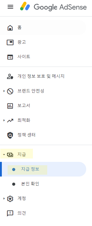 애드센스 사이드바에서 [지급]-[지급 정보] 클릭