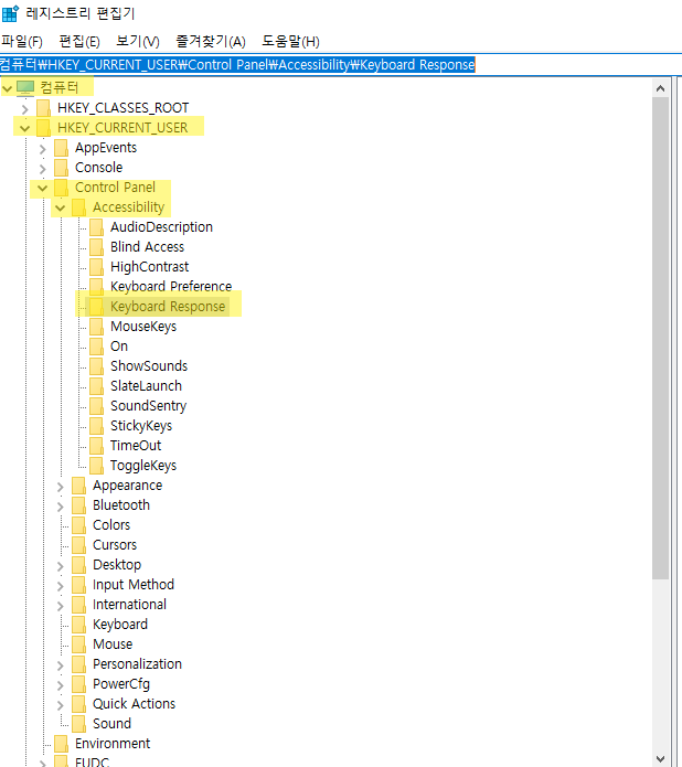 3. 컴퓨터\HKEY_CURRENT_USER\Control Panel\Accessibility\Keyboard Response 이동