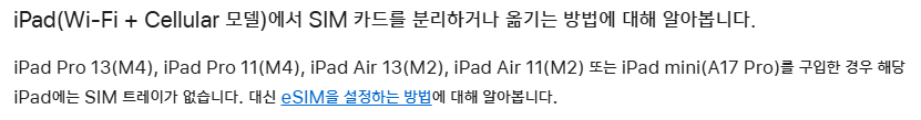 - 추가로 내가 구입한 iPad Air는 SIM트레이가 없는 모델이 있기 때문에 eSIM으로 설정해야 한다.