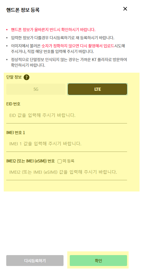 - IMEI2가 없는 경우 미등록 체크 후 확인