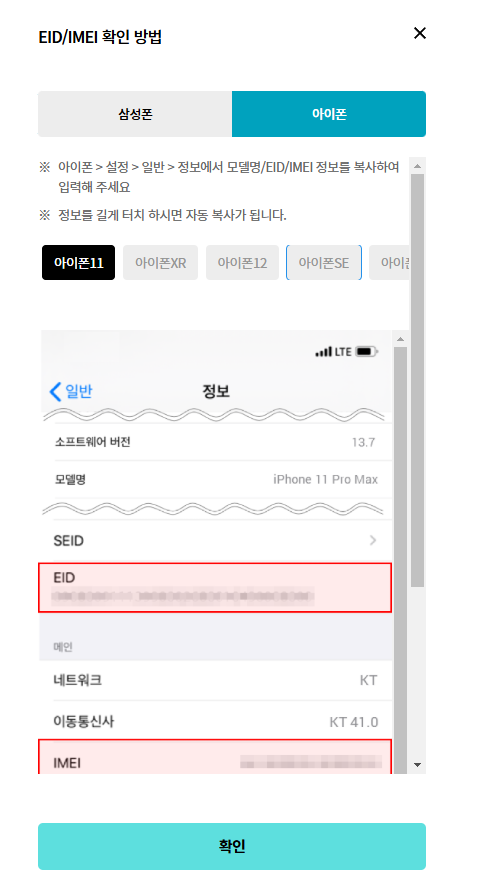 - eSIM 선택 후 EID/IMEI 등록방식 선택