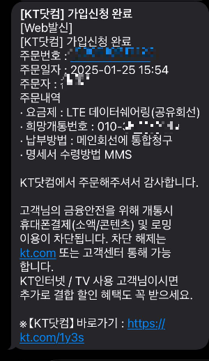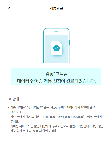 - 1분정도 기다리면 개통 신청 완료 페이지로 이동 및 문자가 수신 된다.