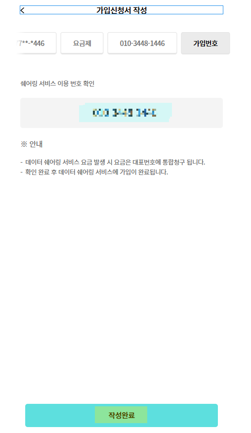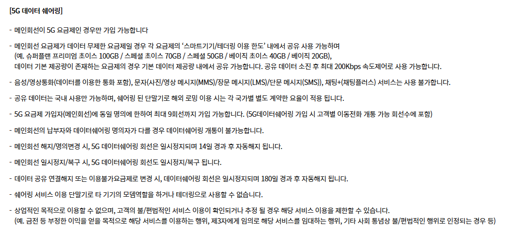 - 5G또는 LTE 데이터 쉐어링(공유회선) 체크 후 확인 클릭