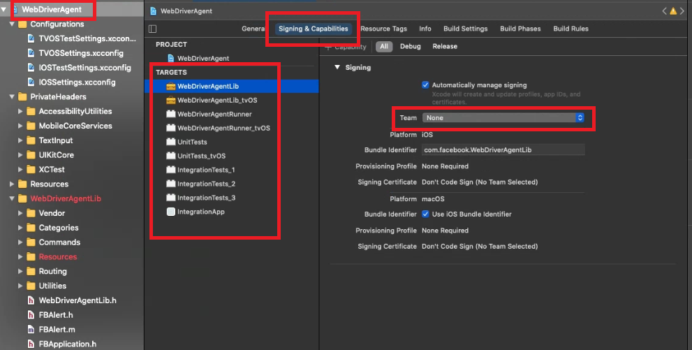 - [WebDriverAgnt]-[TARGETS]의 각 항목에 [Signing & Capabilities]-[Team]에 등록한 인증서 선택