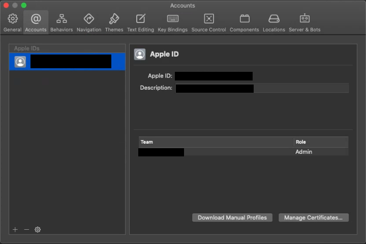 - 상단 [Xcode]-[Preferences]-[Accounts] 선택