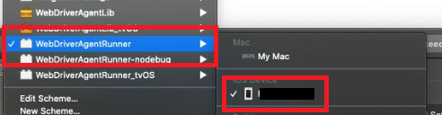 - [configuration dialog]-[WebDriverAgentRunner]-[ios Devices] 선택