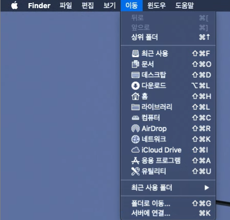 1. Command + k를 눌러 서버에 연결 또는 상단 메뉴 [이동] - [서버에 연결] 선택
