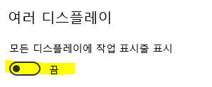 4. 하단에 '모든 디스플레이에 작업 표시줄 표시'를 '끔'으로 셋팅