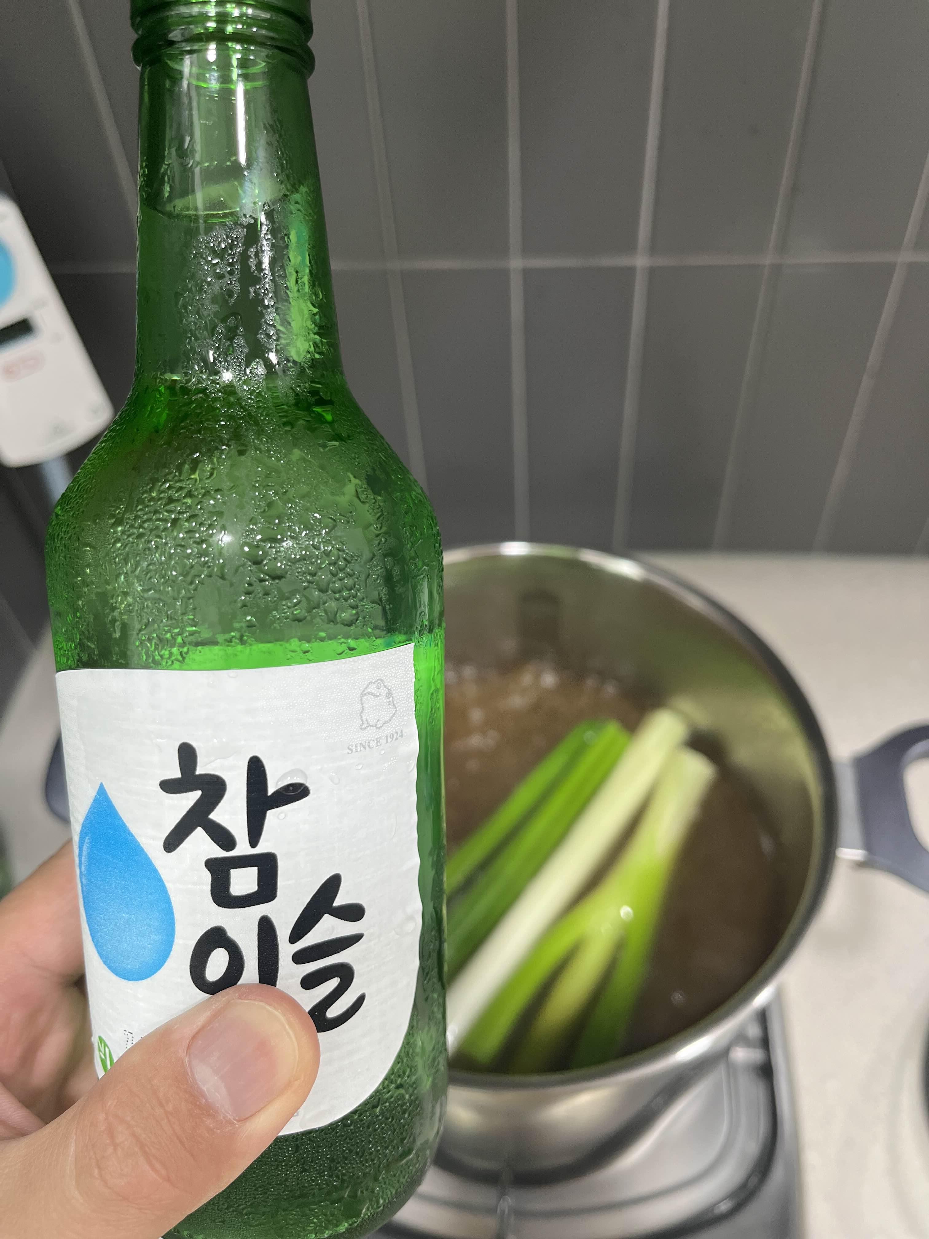 물이 끓기 시작하면 고기를 넣고 소주를 넣어준다.