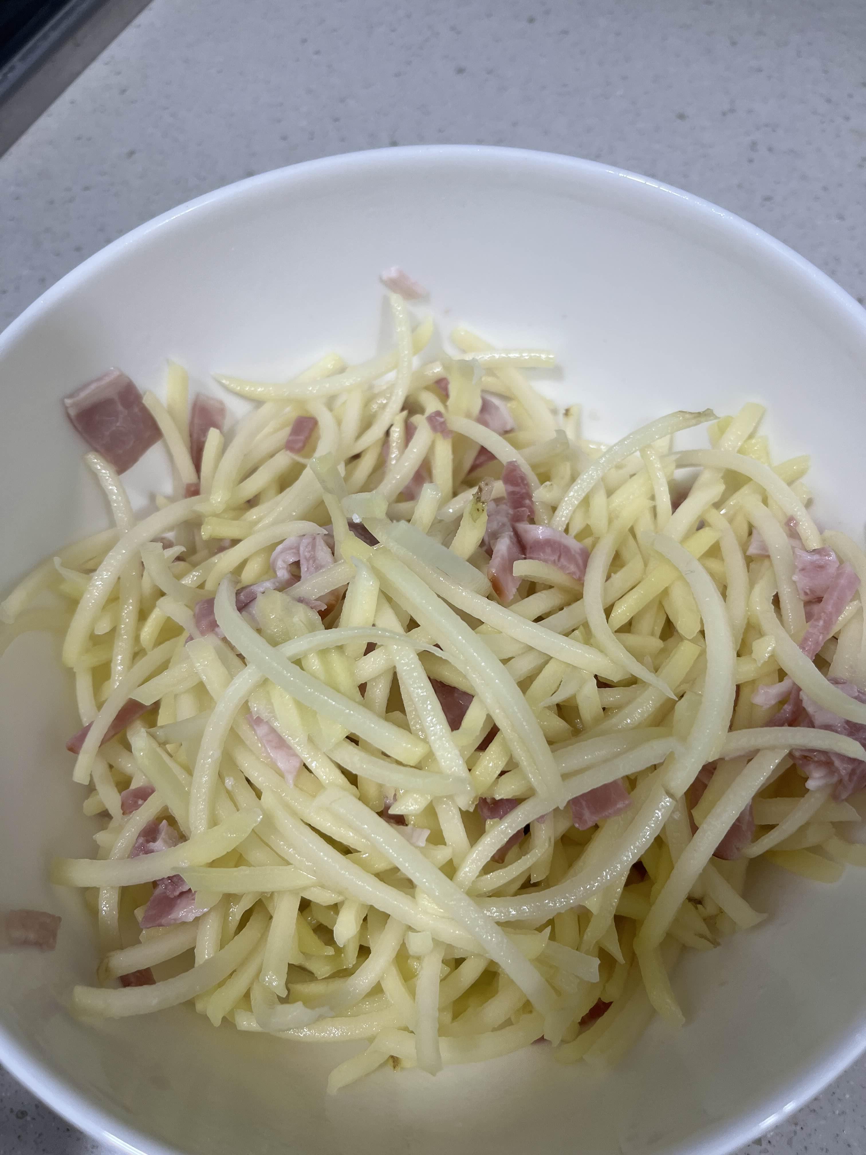 감자채를 기름으로 잘 달궈진 후라이팬에 적당량 올려서 부침개처럼 얇게 핀다.