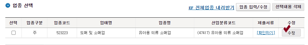 업종 수정 클릭
