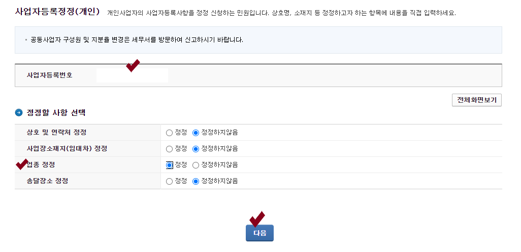 3. 사업자 등록번호를 선택하고 정정사항을 클릭한다.