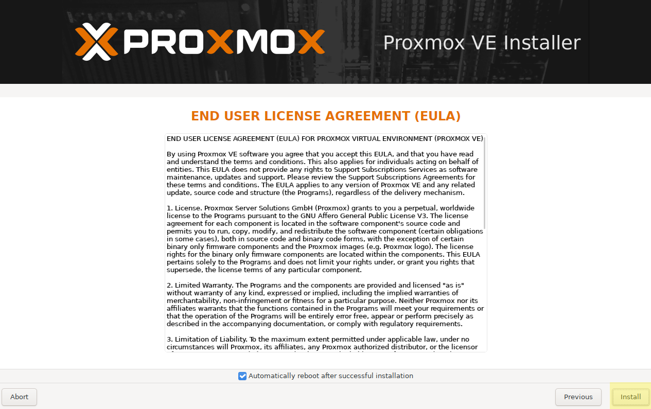 - 설치화면이 나타나면 Install Proxmox VE (Graphical)를 선택한다.