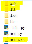 빌드 성공시 build, dist, .spec가 생성된다. build디렉토리는 우리가 크게 신경쓰지 않아도 되는 디렉토리이며, dist는 빌드후의 결과물이 저장되고, spec는 빌드 옵션을 조정하는 파일이다.