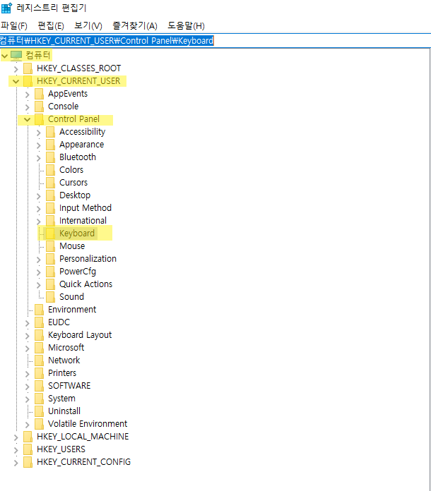 3. 컴퓨터\HKEY_CURRENT_USER\Control Panel\Keyboard 이동