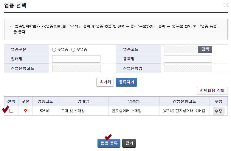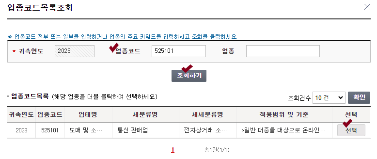 업종코드 입력 -> 조회하기 클릭 -> 업종코드목록에 선택 클릭