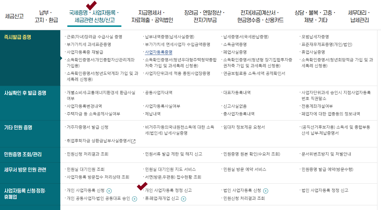 2. 국세증명, 사업자등록, 세금 관련 신청/신고 -> 사업자등록 신청 정정 휴폐업 -> 개인 사업자등록 정정 신고를 클릭한다.