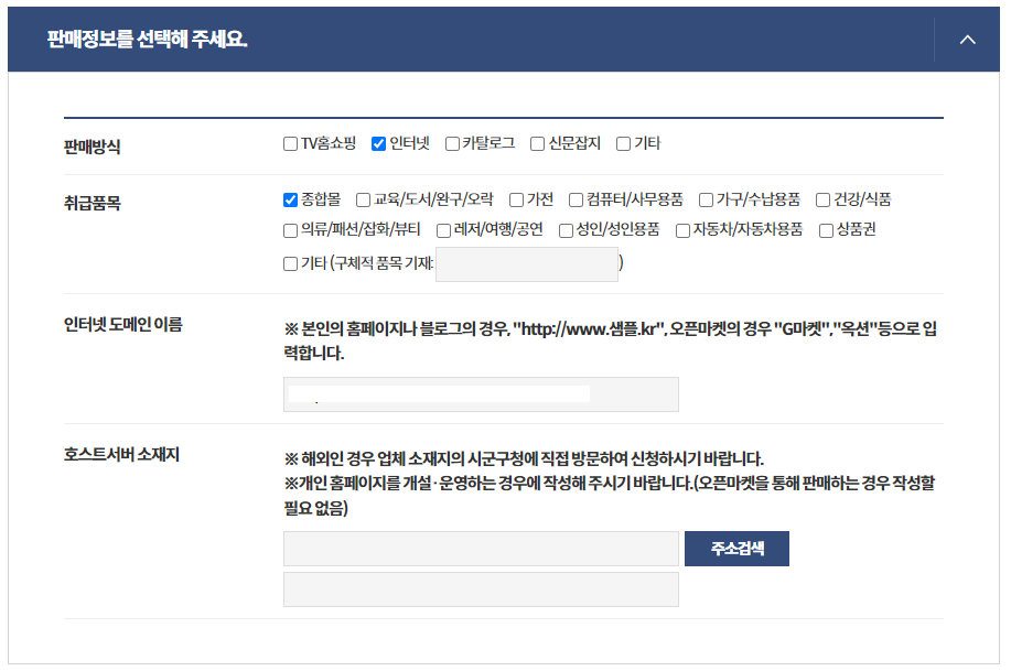 호스트서버 소재지는 네이버 스마트스토어를 사용할 경우 작성할 필요 없음